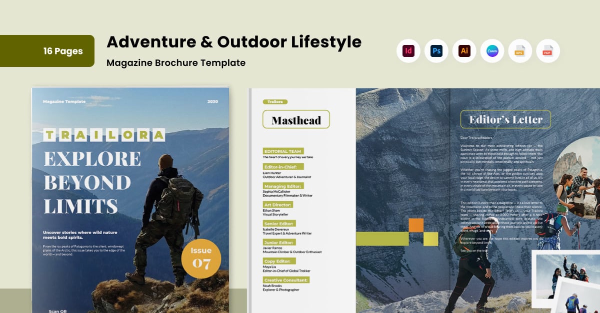 Perfect for brands focused on nature, travel, or active living, this layout uses bold photography and earthy tones to capture the spirit of adventure. Ideal for editorial content or promotional material that inspires exploration. **Highlights:** – 16 customizable pages document – A4 format size with 3mm bleed – Free fonts …
