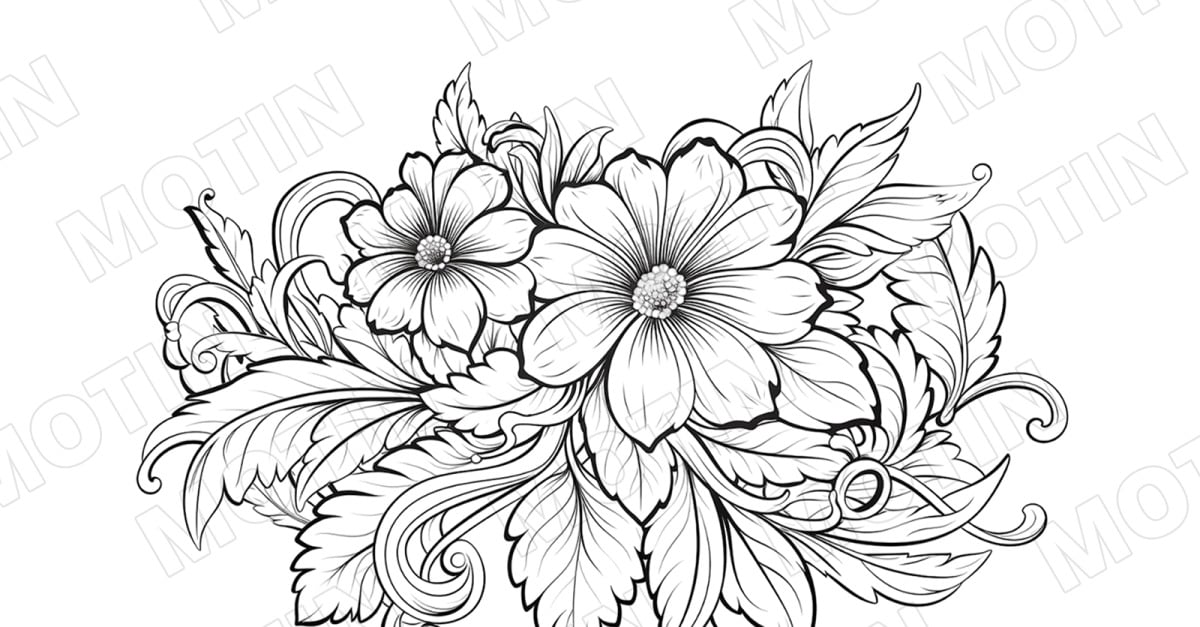 Elegant Floral Blossom Design with Detailed Leaves and Swirling Patterns Black and white artistic floral design featuring blooming flowers, intricate leaves, and swirling elements perfect for coloring, creative design, or decorative applications. aesthetic, art, artistic, beautiful, black and white, blossom, botanical, classic, coloring, craft, creative, decor, decoration, decorative, design, detailed, …