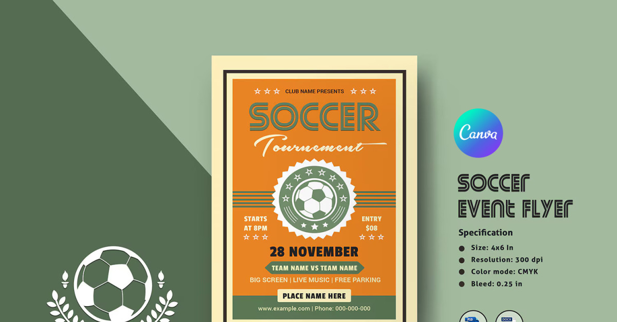 Soccer Event Flyer Template This is not a mock-up FILE INFORMATION Size: 4×6 InResolution: 300 dpiColor mode: CMYKBleed: 0.25 inWorking file: Photoshop cs2 or Later version, photoshop elements & MS WordFiles included: Photoshop cs6 (psd) , MS Word (DOCX) and CanvaFont used: Download link included in help file CONTACT ME …