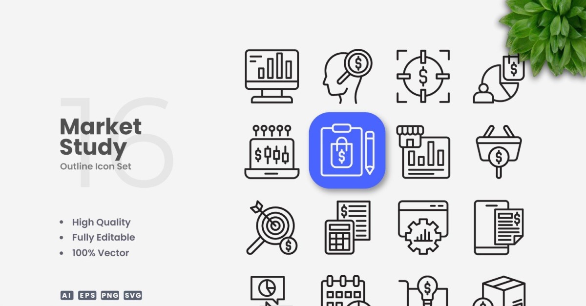 Set of 16 Market Study Outline Icons | Simple and clean design, perfect for websites, mobile apps, books, social media, infographics, flyer, print, banners, posters and many more. To resize or change color you can easily edit on vector software like Adobe Illustrator and CorelDRAW. Features : High Quality Design100% Vector100% …
