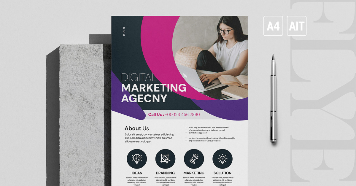Digital Marketing Flyer An elegant, professional, simple and ultra-clean layout for your Flyer or poster. It is very easy to edit, all you need to do is just to change content and images. It’s fully customizable Features: A4 Paper Size (210mm x 297mm)Bleeds (3mm x 3mm)100% Editable & CustomizableColor CMYK, …