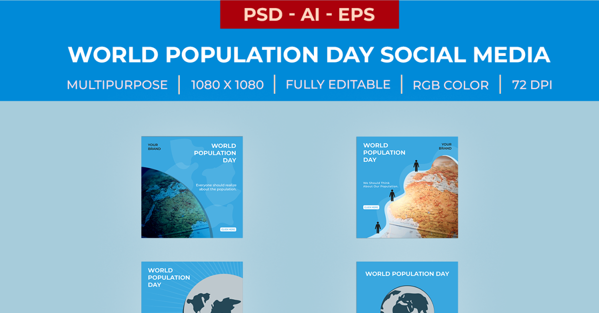 World Population Day Promoting Global Awareness Social Media Template Template Features: 1. Easily customizable and editable 2. Size: 1080×1080 pixels 3. Well-organized layer 4. RGB Color and 72 DPI Resolution 4. Image Not Included Files included: 4 PSD, 4 AI, 4 EPS, Information and include a help file Fonts Download …